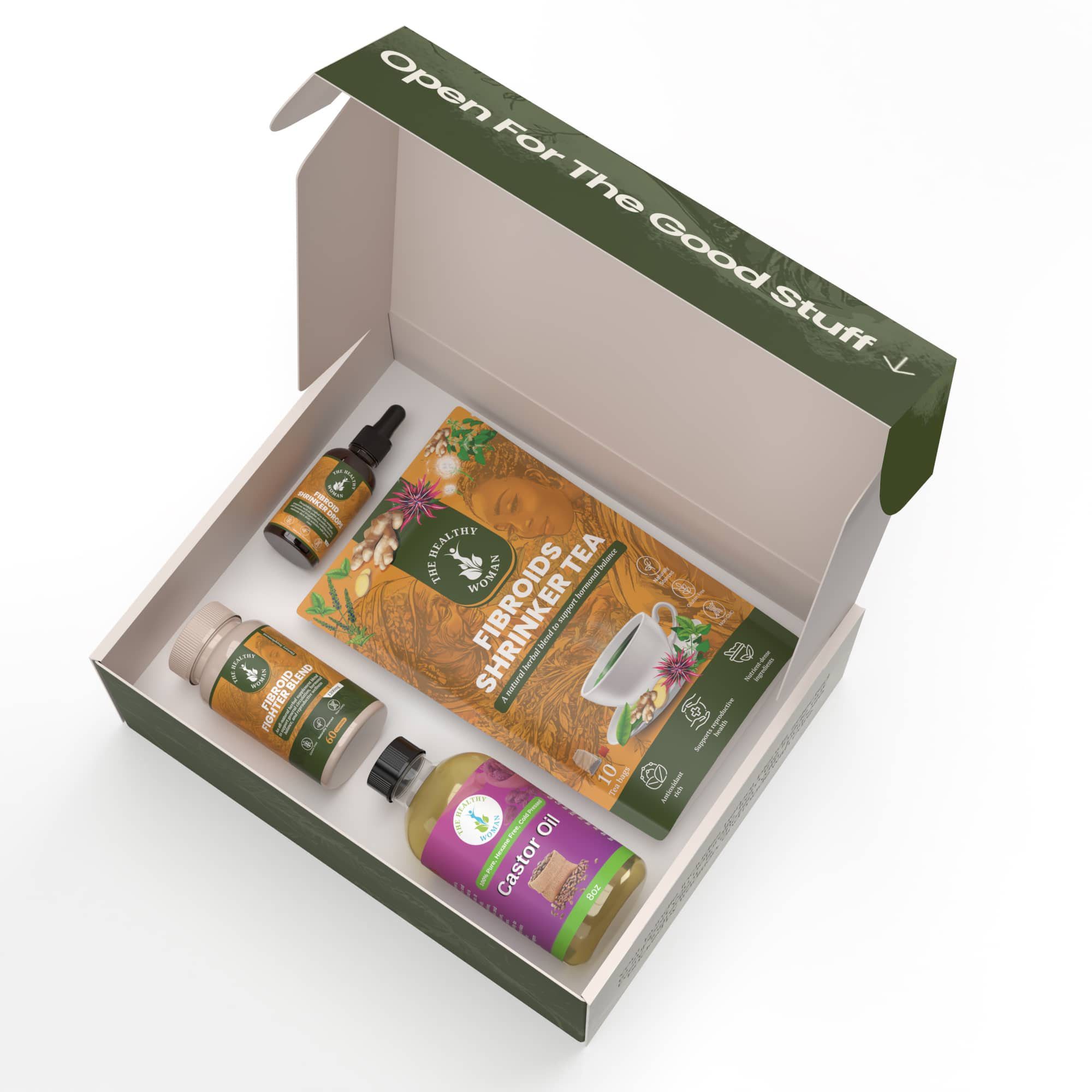 Each product works together. The Fibroid Shrinker Tea and Tincture support detox pathways, hormone balance, and womb comfort.